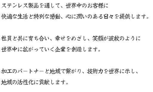 | 2004年8月 | 2004年8月にステンレスインテリア・雑貨のネットショップ「ステンレスインテリア工房 藤本製作所」のホームページを立ち上げ医療用製品以外の製造を開始しました。 |